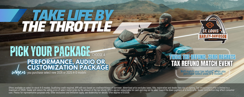 Offers available on select in-stock H-D models. Qualifying credit required. APR will vary based on creditworthiness of borrower. Advertised price excludes taxes, title, registration and dealer fees due at signing. Tax refund match offer is limited to a maximum of $1500. Dealer will reduce the selling price of select motorcycles by the amount of tax refund. Offers are not redeemable for cash and may not be used toward the down payment of a motorcycle. Dealer contribution may affect consumer cost. Photos for representative purposes only. Other exclusions and limitation apply, see dealership for details. Offer expires 4/11/26.